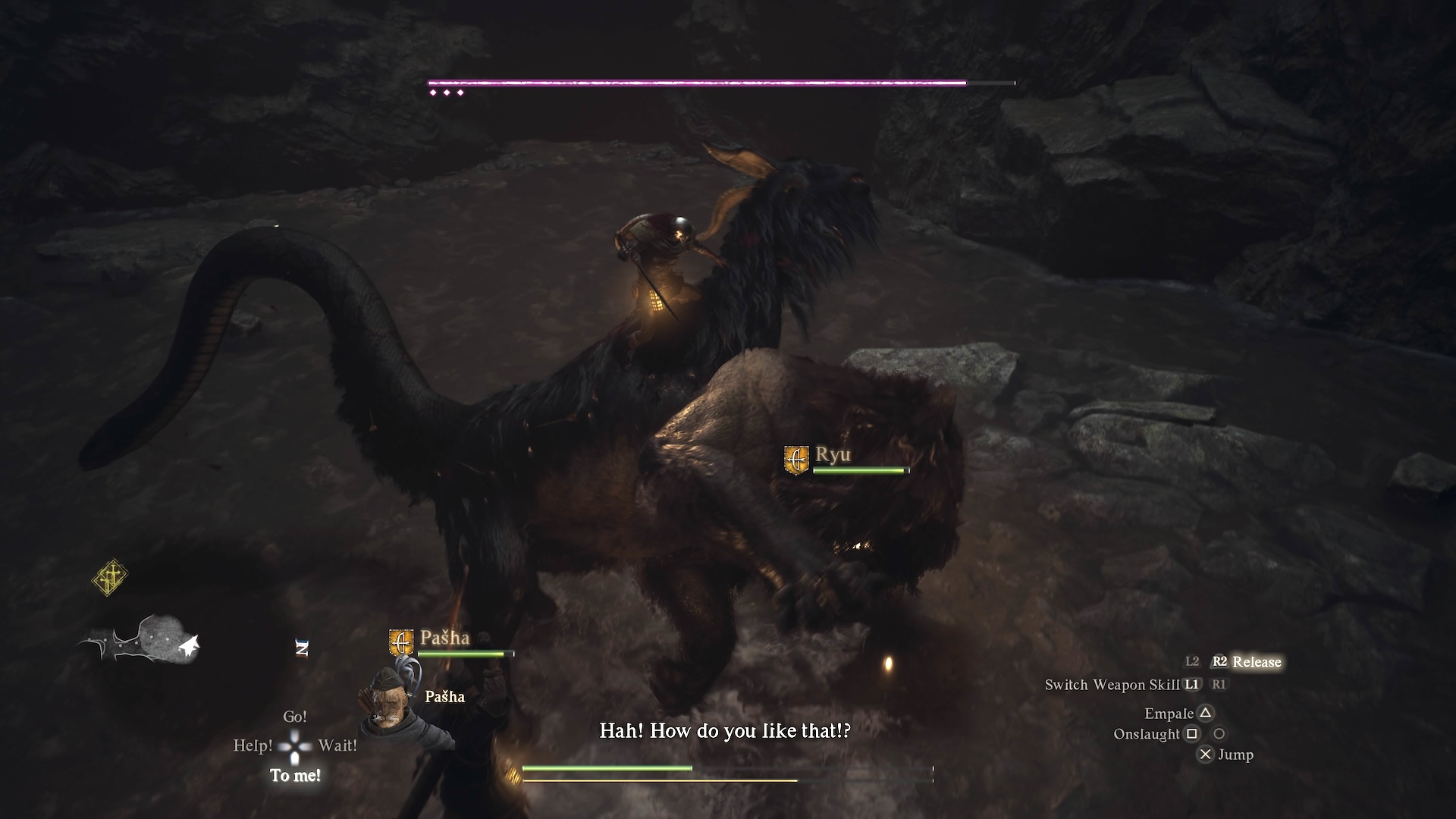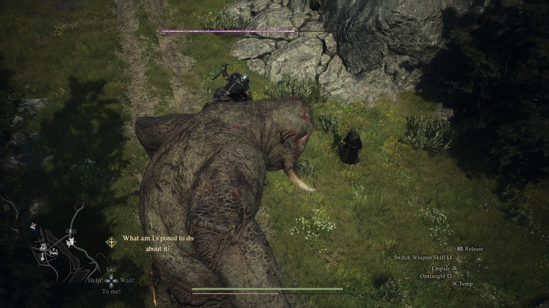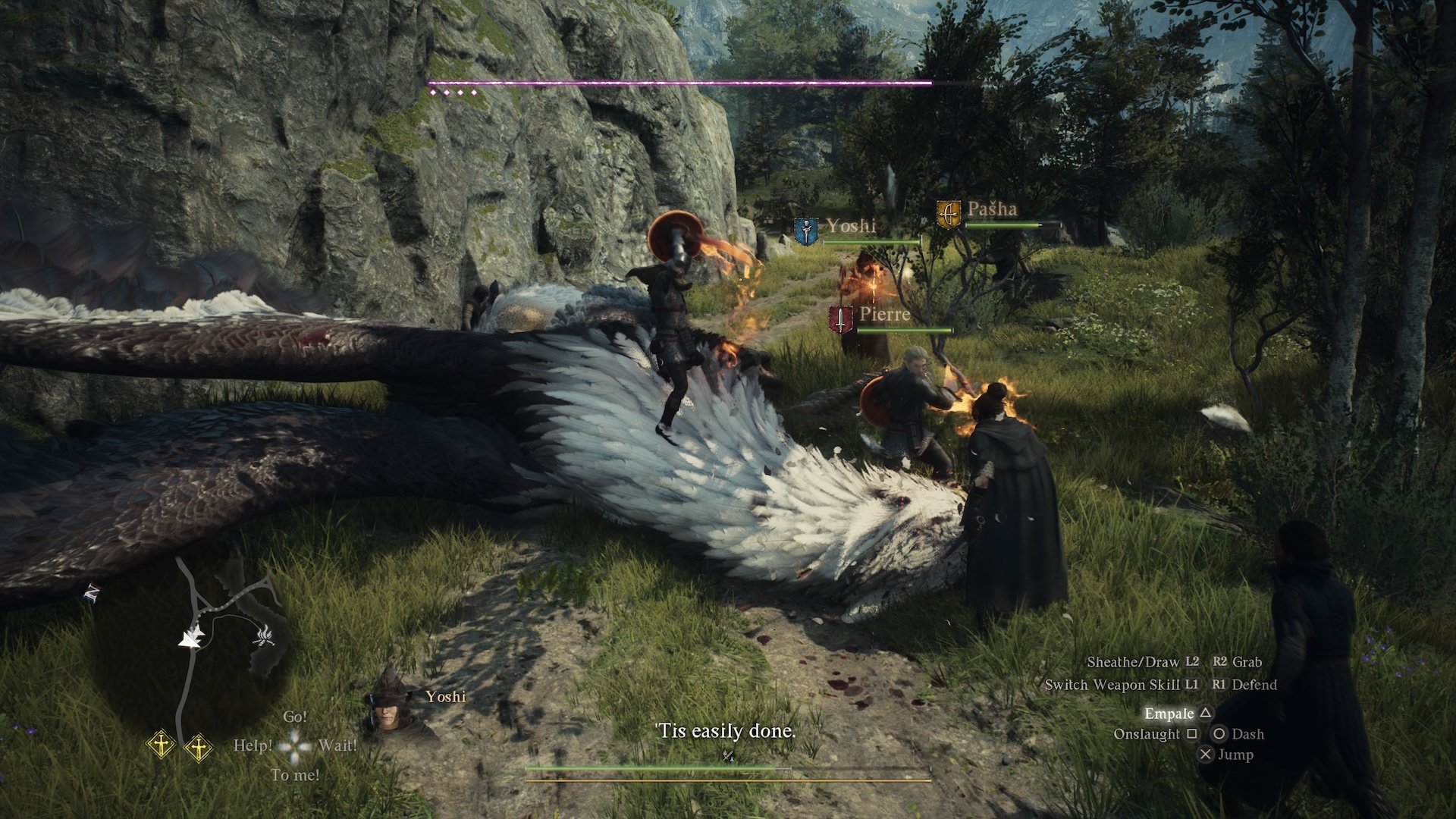 Dragon’s Dogma 2:n parhaat kertomukset eivät ole kumpua käsikirjoittajan kynästä, vaan sen erikoisista pelimekaniikoista. Etenkin taisteluissa sattuu ja tapahtuu. Vihollisia harvennetaan perinteisin lyönnein ja loitsuin, mutta kaikki ihmistä pienemmät voi vaikka nostaa ilmaan ja viskata kalliolta. Isoimmat viholliset kaatuvat kuin tarustoissa konsanaan: kyklooppi päihitetään kiipeämällä päälle ja tuikkaamalla terä silmään, kun taas lohikäärmettä viilletään suoraan sydämeen. Vihollistyyppejä ei ole montaa, mutta ne käyttäytyvät uskottavasti. Sudet nappaavat pelaajan hampaisiin, harpyijat laulavat uneen, peikot istuvat päälle ja haavoittunut aarnikotka ravistelee poloisen sankarin pilvien kautta jorpakkoon. Taistoon käydään vain harvoin yksin; taakkansa kantavat niin satunnaiset sivulliset ja kuin pelaajan tekoälykaveritkin. Lopulliset taktiikat riippuvat hahmoluokista ja taidoista, mutta Soulsbornejen tarkkuutta tai hienostuneisuutta on turha odottaa – Dragon’s Dogma 2:n taistelukentillä vallitsee holtiton ja hupaisa kaaos.