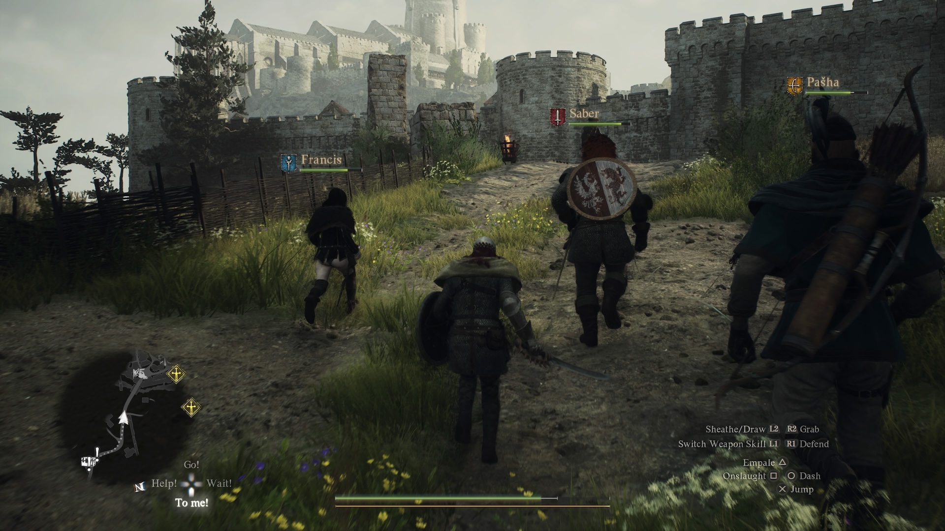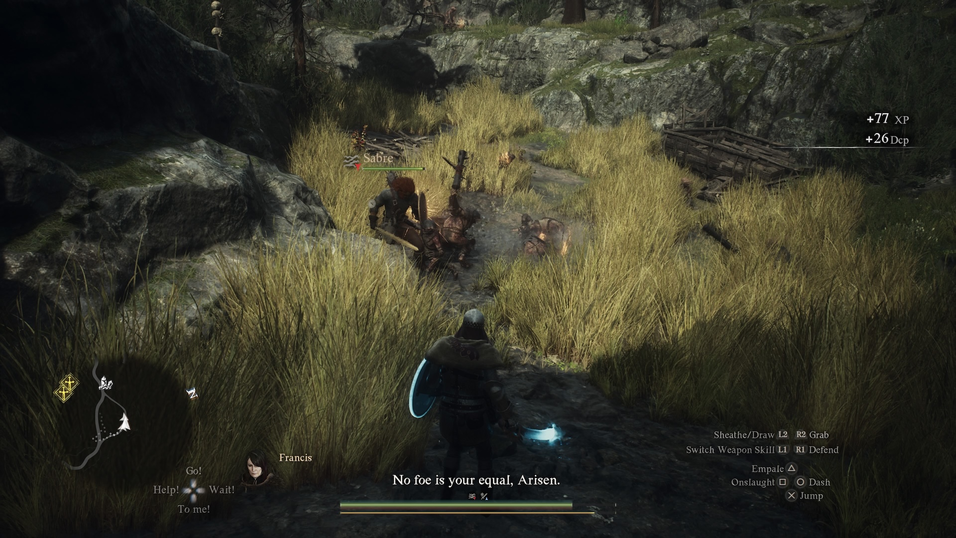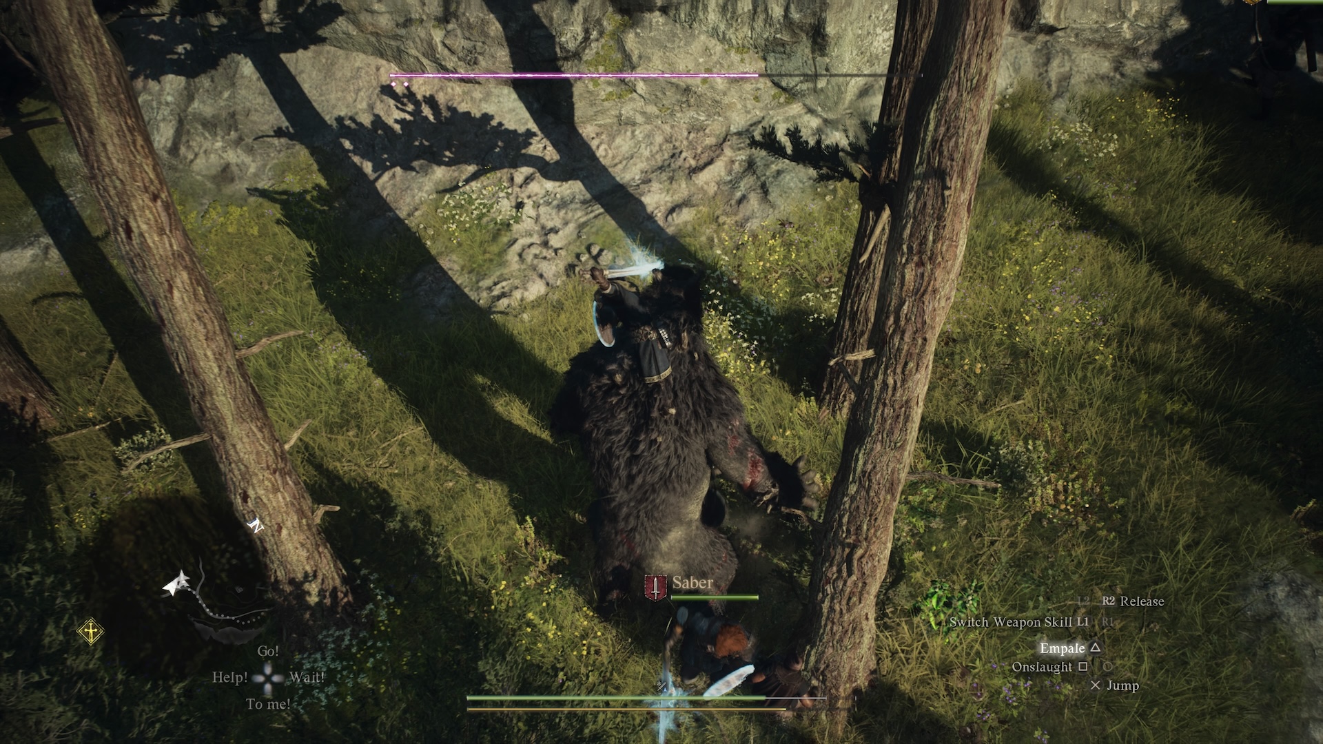 Dragon’s Dogma 2:n parhaat kertomukset eivät ole kumpua käsikirjoittajan kynästä, vaan sen erikoisista pelimekaniikoista. Etenkin taisteluissa sattuu ja tapahtuu. Vihollisia harvennetaan perinteisin lyönnein ja loitsuin, mutta kaikki ihmistä pienemmät voi vaikka nostaa ilmaan ja viskata kalliolta. Isoimmat viholliset kaatuvat kuin tarustoissa konsanaan: kyklooppi päihitetään kiipeämällä päälle ja tuikkaamalla terä silmään, kun taas lohikäärmettä viilletään suoraan sydämeen. Vihollistyyppejä ei ole montaa, mutta ne käyttäytyvät uskottavasti. Sudet nappaavat pelaajan hampaisiin, harpyijat laulavat uneen, peikot istuvat päälle ja haavoittunut aarnikotka ravistelee poloisen sankarin pilvien kautta jorpakkoon. Taistoon käydään vain harvoin yksin; taakkansa kantavat niin satunnaiset sivulliset ja kuin pelaajan tekoälykaveritkin. Lopulliset taktiikat riippuvat hahmoluokista ja taidoista, mutta Soulsbornejen tarkkuutta tai hienostuneisuutta on turha odottaa – Dragon’s Dogma 2:n taistelukentillä vallitsee holtiton ja hupaisa kaaos.