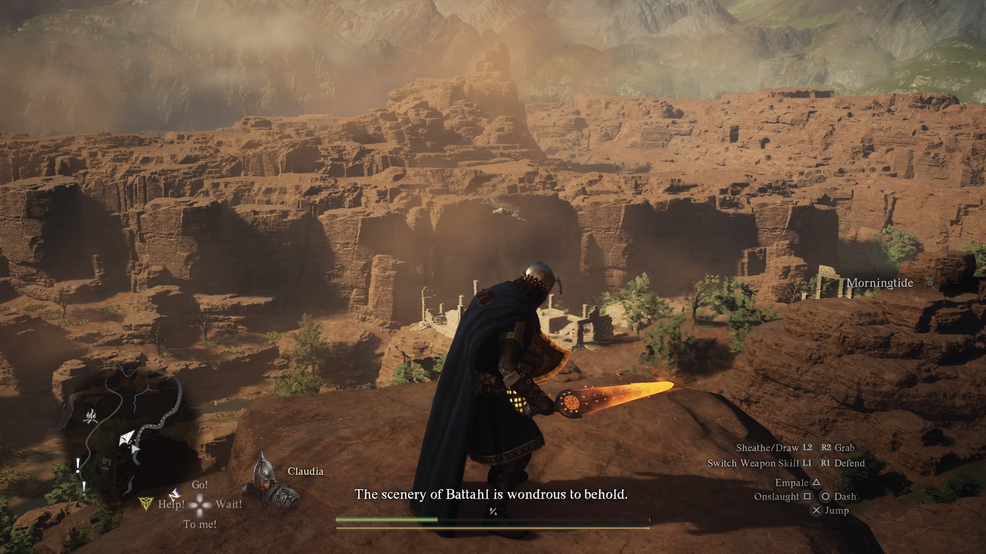 Dragon’s Dogma 2:n pelimaailma on sanalla sanoen onnistunut. Äkkiseltään avoimelta vaikuttava kahden valtakunnan raja koostuu vesistöjen ja vuoristojen halkomista kulkuväylistä, jotka ovat viimeistä nurkkaa myöten pullollaan aarteita, vihollisia, luolia ja muuta tututumisen arvoista. Se mikä hävitään pelialueiden rajoissa, voitetaan laadussa: Dragon’s Dogman ympäristöistä ja kohtaamisista huokuu vahvempi käsityön tuntu kuin vaikkapa Skyrimista. Peli ei kuitenkaan sorru liialliseen ohjailuun ja kädestä pitelyyn, vaan oikeastaan päin vastoi – pelaajan on täysin mahdollista eksyä juonen kannalta mitä epäolennaisimpiin paikkoihin. Koska pelin ainoa pikamatkustusväline on kallis, harvinainen ja hankala, ei pinteestä välttämättä pääse kuin samoilemalla tuntitolkulla takaisin. Jossain muussa pelissä pitkiä välimatkoja voisi pitää isonakin ongelmana, mutta Dragon’s Dogma 2:ssa upeat maisemat ja värikkäät kohtaamiset muodostavat oikeastaan pelaamisen ytimen. Jopa useimmat tehtävät ovat pelkkää paikasta toiseen kulkemista, joissa matka on paljon kiinnostavampi kuin määränpää.