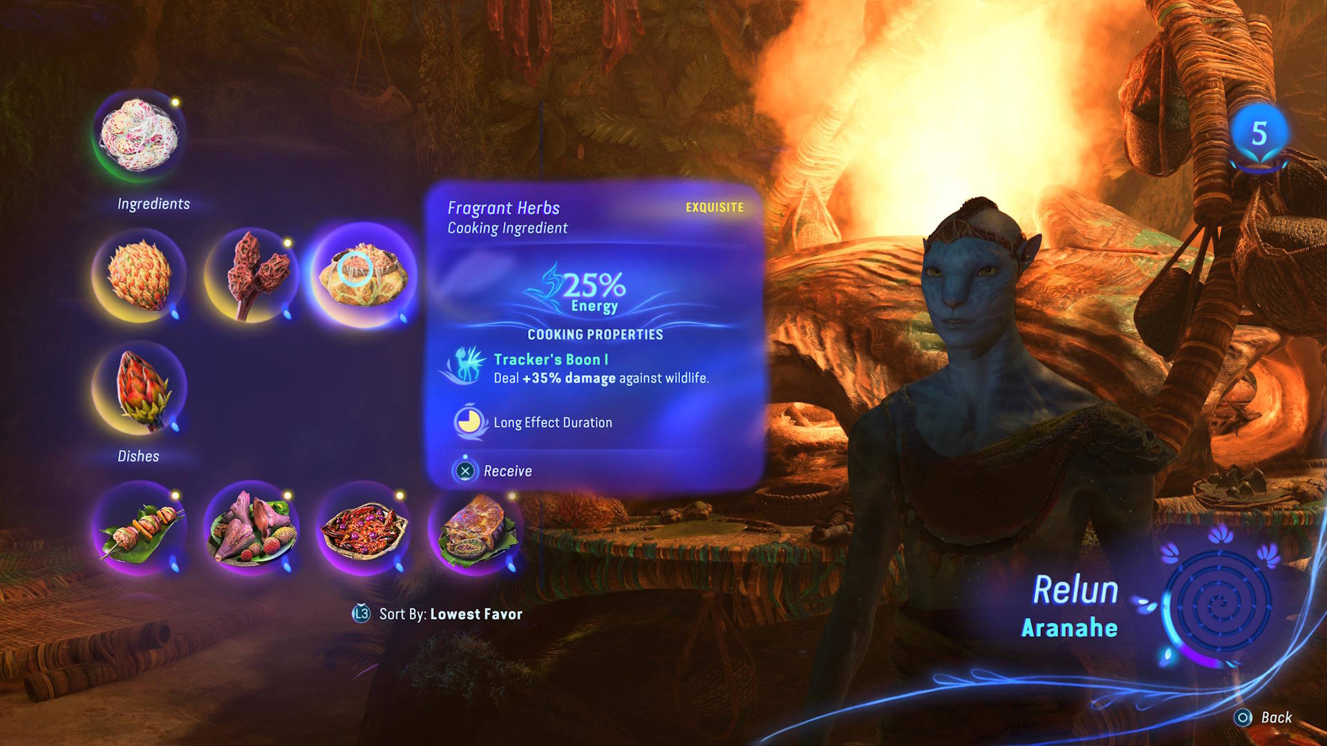 Far Cry -pelimekaniikkaan Avatar: Frontiers of Pandora kuitenkin kaikesta huolimatta silti vahvasti nojaa. Pelaaja craftaa muun muassa erityyppisiä ammuksia jousipyssyynsä ja ritsamaiseen heittimeensä luonnon antimia kantopussukkaan repien. Luonnon antimista voidaan valmistaa jos jonkinlaisia ruokayhdistelmiä, jotka eivät pelkästään palauta elinenergiaa, vaan myös boostaavat pelaajan statseja kymmeneksi tai pariksi kymmeneksi minuutiksi. Reilu syöminen kannattaakin usein ennen viholliskoitosta. Ruokien valmistamiseksi on ensin kerättävä raaka-aineet ja sitten etsitään kokkauspiste, joita maailmassa on runsaasti. Improvisoiduista kokeiluista syntyy hauskoja ja yllättäviä reseptejä, joita voi merkata eräoppaan muistiin suosikeiksi. Raaka-aineet pitää aina irrottaa kasveista manuaalisella työllä, olipa kyseessä hedelmäpuun tuote tai sammaloituneen puun rungossa kasvava valtava sieni. Oikeaoppinen irrotus takaa parhaan arvon, mutta myös vuorokaudenajalla on hauskasti merkitystä sadonkorjuuseen. Mikäli sadonkorjuun ajankohta ja oikeaoppinen irrotus molemmat toteutuvat, on raaka-aine parhaassa mahdollisessa kunnossa.