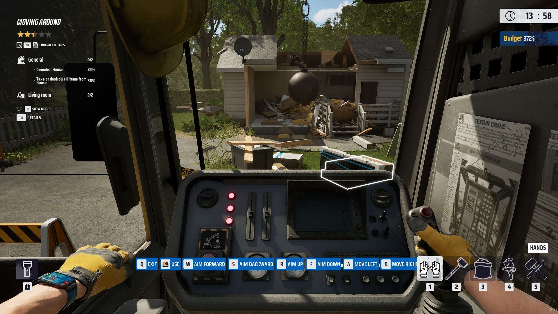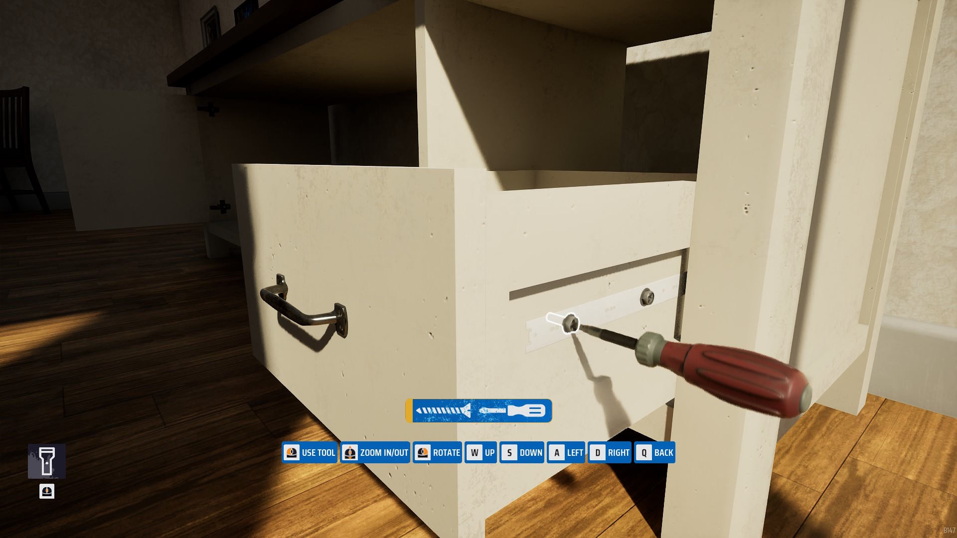 Kontrollien osalta huomasin usein aloittavani pelisessioni hiiri-näppis -kombolla, kunnes valitsin hieman jouhevamman peliohjaimen, joka etenkin työkalujen käytössä on mukavampi. Pääasiallisesti kaikki toiminta tapahtuu liipaisimilla, kun taas olkapäänappuloilla voidaan valita työkalumoodia, oli se sitten leka, roskapussi, pelkät kädet tai tavaraskanneri. Hiirellä ja näppiksellä pelatessa esimerkiksi taltan käyttäminen on hiiren sivuttaisvatkaamista ja ruuveja ruuvataan pitämällä vasenta hiirennappia pohjassa ruuvin päällä. Huomasinkin, että padilla pelatessa nämä monotonisemmat toiminnot tuntuivat peliohjaimelta käsin hieman siedettävämmältä puuhalta.