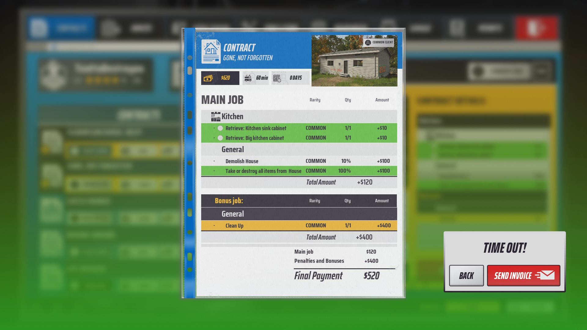 Alussa on hankalampaa, kuten aina. Pelaaja alkaa tienata pikku hiljaa taskurahaa suorittamalla annettuja toimeksiantoja ja mielellään viedään ne loppuun sadan prosentin tarkkuudella. Toistuvia kuluja ovat muun muassa varaston vuokrakulut sekä auton kuluttama bensa työmatkojen aikana. Vahingollisesta asiakkaan tavaroiden rikkomisestakin tulee miinusta. Ei siis jätetä sitä tiskiallasta tai sänkyä purkamatta, koska ei vaan huvittanut.