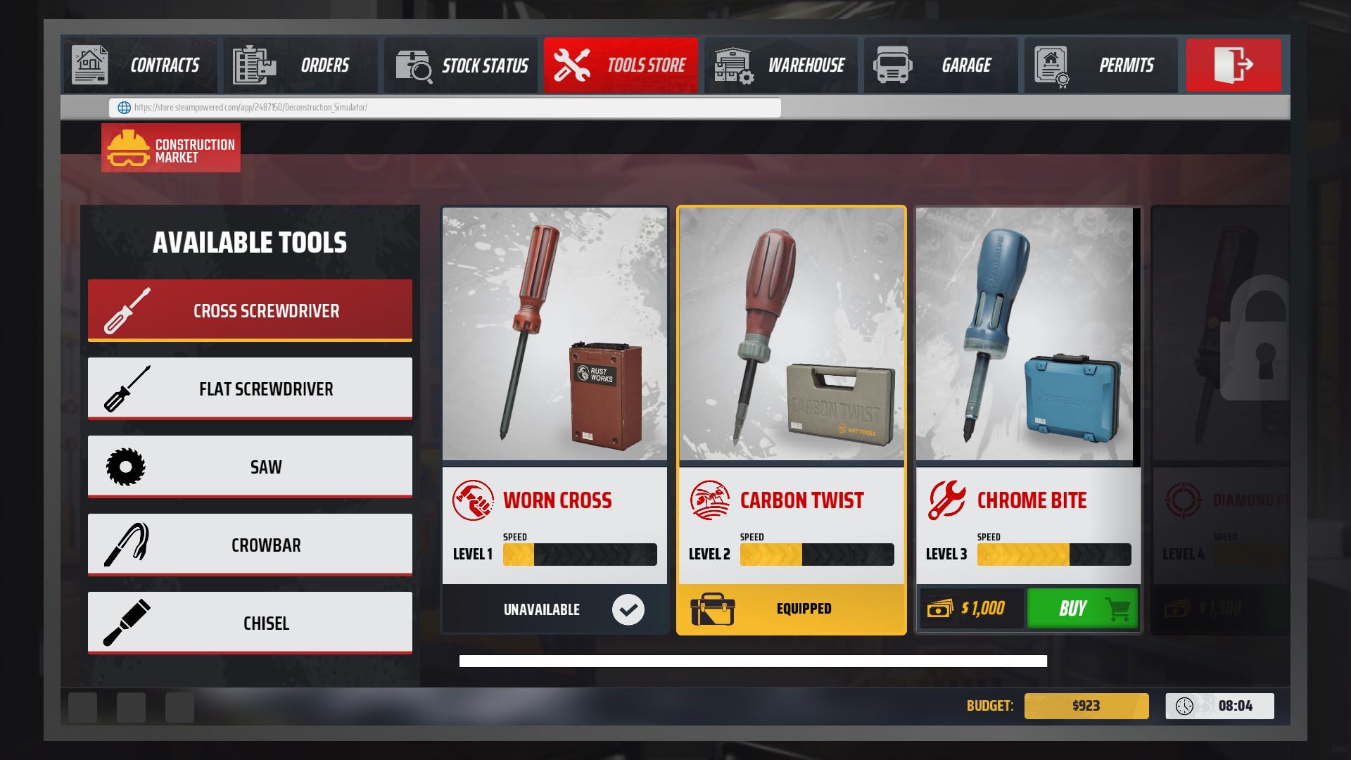 Varastotilojakin voidaan laajentaa ja sisustaa uusilla ostettavilla hyllyillä ja varastoon voi rakentaa autotallin, jonka jälkeen pääsee ostamaan isompaa pakua. Erilaisia autoja on viisi, joista viimeinen onkin jo kuorma-auto. Eniten löpöä kuluttava, mutta tilaa riittää, joten ajokertojen määrä varastolta työmaalle vähenee. Autoa voi vaihdella sen mukaan mikä tarve pelaajalla on: kevyemmälle työmaalle sopii yhä se vanha pikkupakukin.