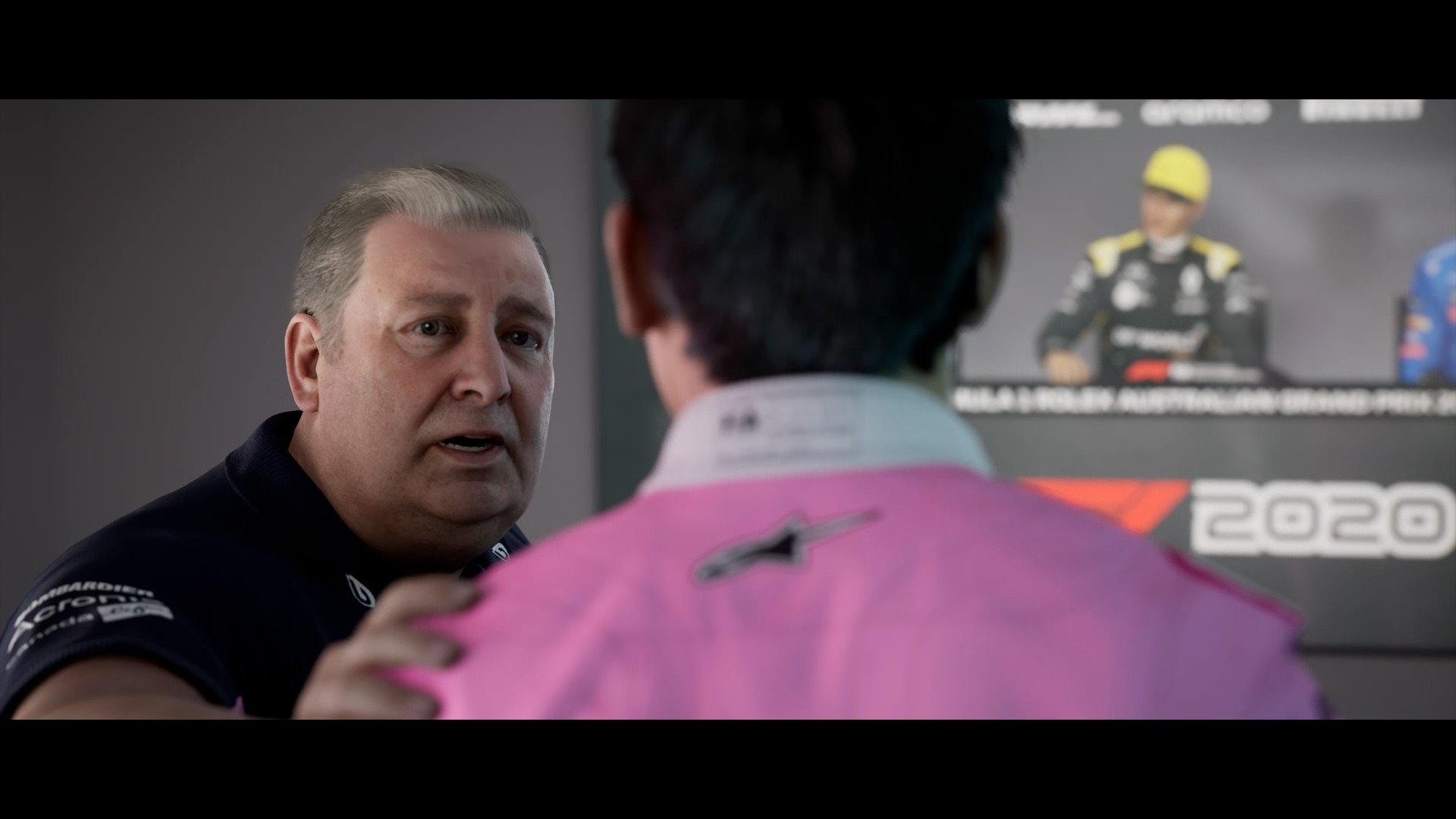 Kolmantena osapuolena tarinassa toimii paluun tekevä ja eri tallissa ajava machoilija Devon Butler – eräänlainen kiusaajahahmo, joka vinoilee kulisseissa ja yrittää itsekin laittaa lusikkaansa draamasoppaan aina kun voi. Riippuen siitä minkä muutamasta tarjolla olevasta F1-tallista pelaaja valitsee, korvataan valitun tallin oikeat kuskin Aidenilla sekä Casperilla ja Butler ottaa hänkin yhden paikan – omassa tarinassani Räikkönen joutui väistymään Alfa Romeolta ja tappelukaverit ajoivat RacingPointilla, myöhemmin Aston Martinilla.