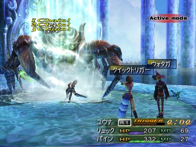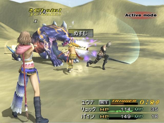 Edellisten Final Fantasyjen tapaan satunnaisia taisteluja on runsaasti. FF X:n täysin vuoropohjainen taistelujärjestelmä on jätetty unholaan ja X-2 käyttää vanhemmista sarjan peleistä tuttua Active Time Battlea. Tämä tarkoittaa käytännössä sitä, että jokaisella taistelukentän osapuolella on aikamittari, jonka täytyttyä kyseinen hahmo kykenee toimimaan. Liikkeensä harkitsemiseen ei kannata käyttää liikaa aikaa, koska ajan kuluessa viholliset käyvät armotta päälle, vaikkei itse olisikaan ehtinyt iskeä. Alkuun taistelut tuntuvatkin melkoiselta sähellykseltä, mutta systeemiin tottuu nopeammin kuin vihollisten vaikeustaso alkaa sitä vaatia. Hahmolle sallitut liikkeet määräytyvät opittujen taitojen perusteella.