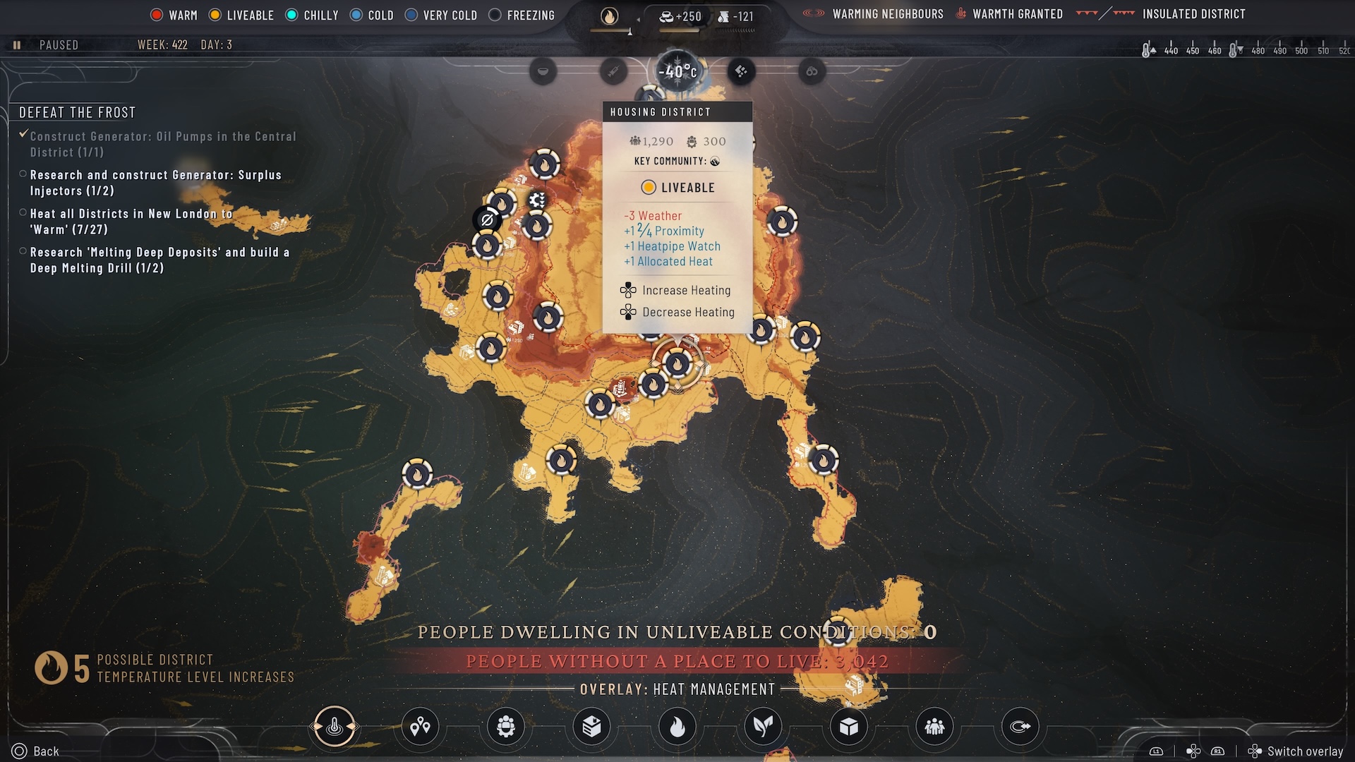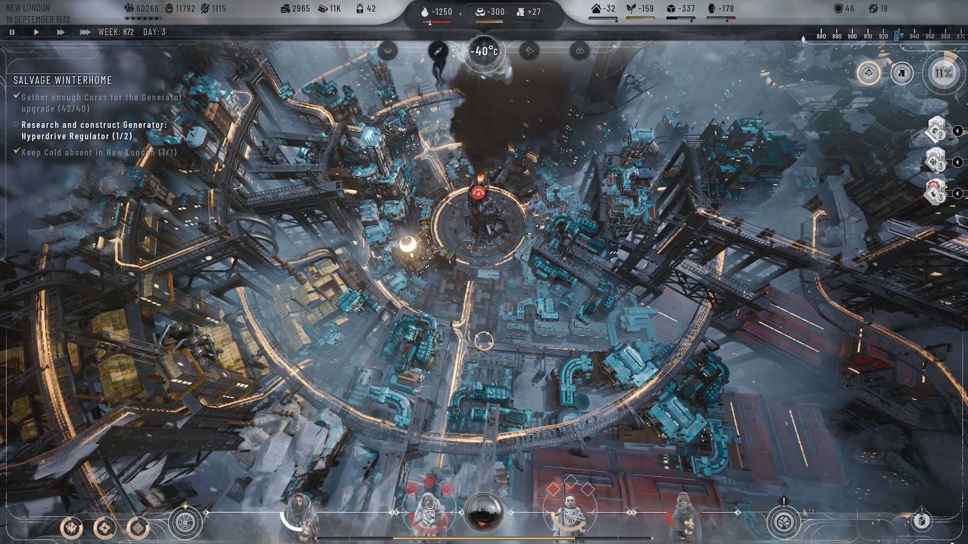 Upea teemoituksensa ja moraalisia dilemmoja tarjoilevan tarinan alta löytyy klassinen resurssi- ja rakentelusimulaatio. Massiivisen lämpövoimalan ympärille rakentuvaa kaupunkia laajennetaan kaavoittamalla asuinalueita, teollisuutta, kaivoksia sekä maatiloja. Jokaisella korttelityypillä on oma funktionsa: asuinalueet tarjoavat suojaa kodittomille, maatilat ruokaa ja erilaiset resurssit kerätään kaivoksista ja vanhan maailman rippeistä. Jokaiselle korttelille mahtuu yksi erikoisrakennus, joka voi olla mitä tahansa sairaalasta lämmönjakelukeskukseen tai ilmanlaatua parantavaan filtteröintitorniin. Mikään ei kuitenkaan toimi ilman resursseja, joista tärkeimmät ovat työvoima ja lämpö – etenkin lämpöä riittää useimmiten vain osalle ja liian koleat työ- tai asuinolosuhteet johtavat nopeasti tyytymättömyyteen ja sairasteluun. Puutteiden laiminlyönti romahduttaa lopulta koko yhteiskunnan.