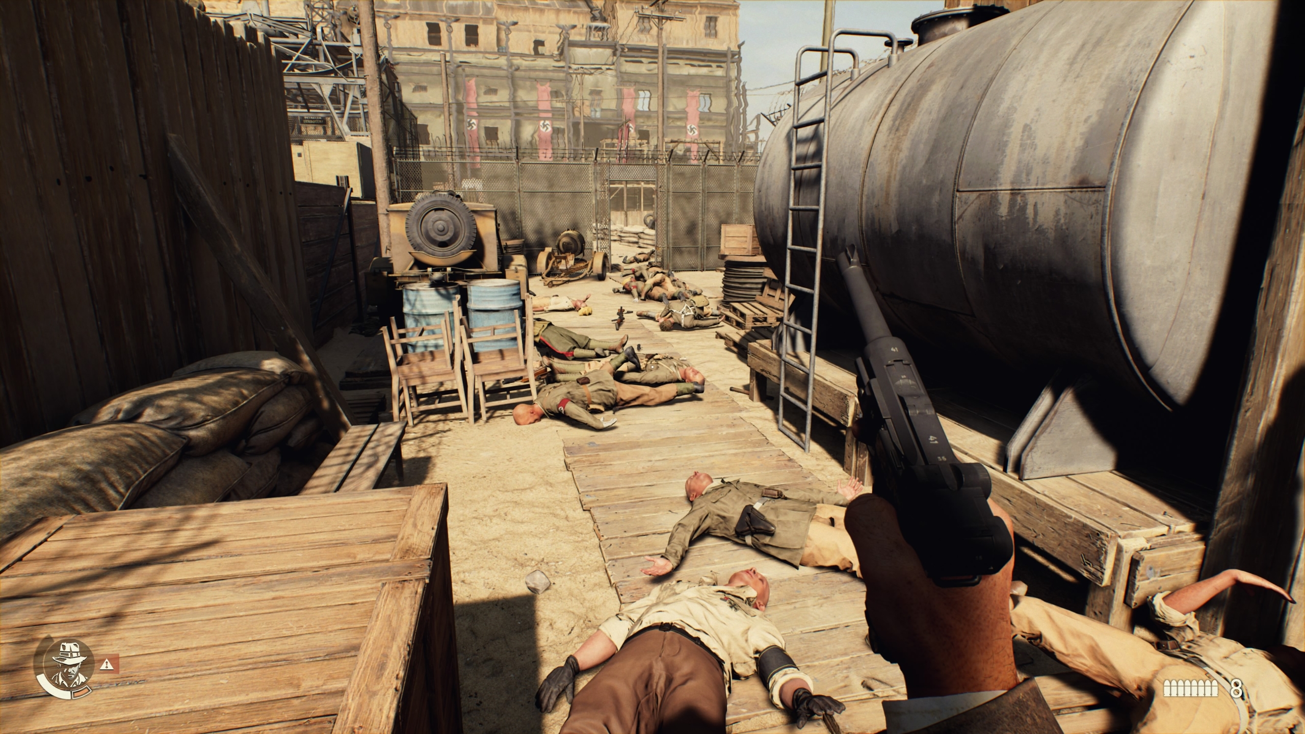 Se, ettei myöskään pelaaja suhtaudu fasistien ja natsien leireihin kuin interaktiivisiin ampumaratoihin, on oikeastaan pienoinen ihme. Hiiviskely on hankalaa ja se menee helposti pieleen, jonka lisäksi vihollisten tekoäly on jallitettavissa ovesuihin ja muihin pullonkauloihin. Jossain toisessa pelissä tilaisuus houkuttaisi digitaaliseen verilöylyyn, muttei Indyssa. Ympäristöt ovat täynnä pulloja ja paistinpannuja, jotka kaatavat kovankin natsin iskulla tai parilla, eivätkä ampuma-aseet ole välttämättä sen tehokkaampia. Luotien syöttäminen revolveriin on lisäksi erittäin hidasta, eikä natseilta poimittuja aseita voi ladata laisinkaan. Rehti tappelu nyrkein ja harjanvarsin on yleensä paljon siistimpää ja kätevämpää. Kenties vieläkin isomman vaikutuksen omaan käytökseeni tekivät kuitenkin viholliset: Mussolinin fasistit taikka Vossin natsit eivät tartu aseeseen ihan pienestä, vaan yrittävät taltuttaa Indyn ensijaisesti lähitaisteluasein. Pelaajalla ei ole oikein hyvää syytä eskaloida taistelua, jonka lisäksi nyrkkiään heristävän vihollisen ampuminen tuntuu yksinkertaisesti aika väärältä.