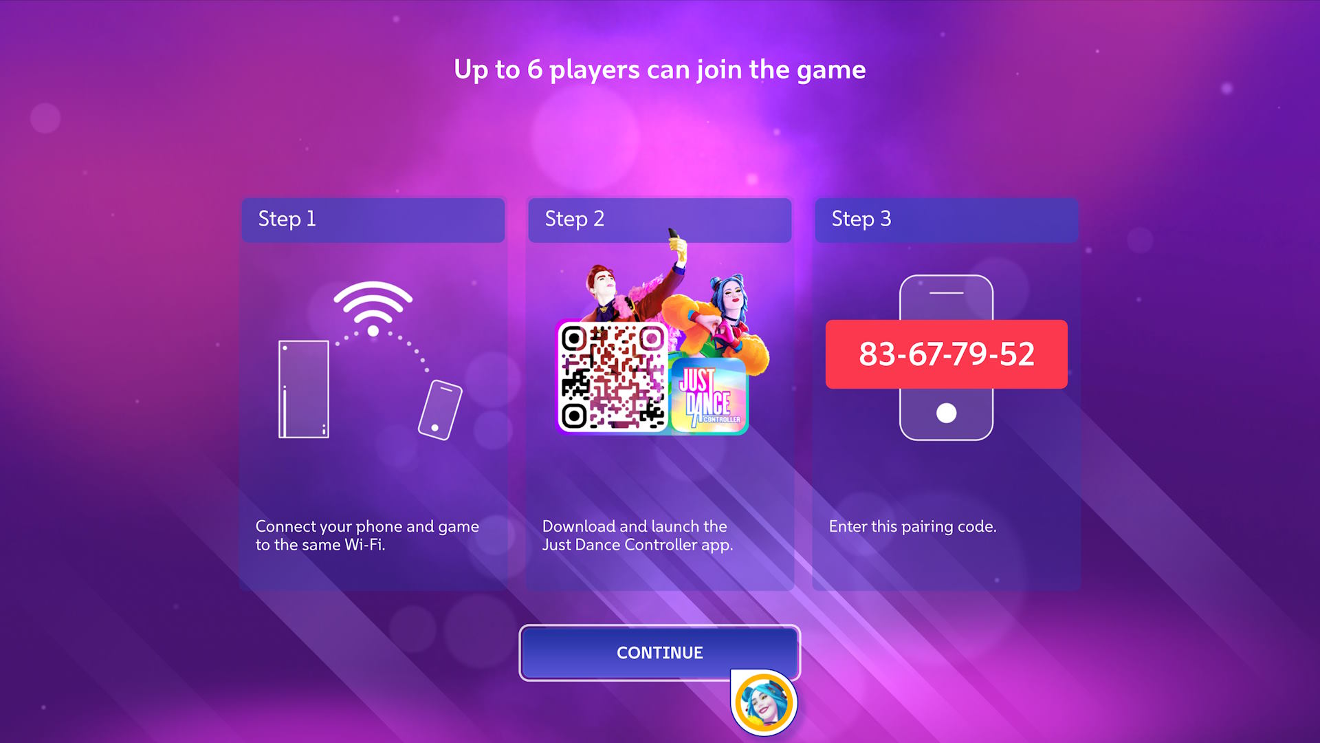 Alkuruudusta skannataan näppärästi QR-koodi, joka heittää puhelimen sovelluskauppaan, Just Dance -sovelluksen sivulle. Ladataan appi ja sitten naitetaan peli sen kanssa yhteen naputtelemalla sovellukseen TV-ruudulla näkyvä parituskoodi. Luonnollisesti puhelimen sekä konsolin tulee olla samassa WLAN-verkossa.