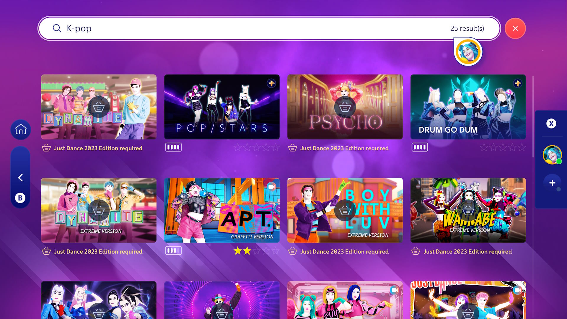 Isäntäpelaaja sitten hoitaa puhelimellaan valikoissa selaamisen ja biisivalinnan. Sinänsä useamman vuoden mukana ollut hubin kaltainen jättivalikko, josta löytyvät kaikki mukana tulevat biisit, kuin maksullisen puolen biisitkin, on varsin kätevä luettelo. Biisejä tanssimalla oman tanssiprofiilin taso nousee ja erilaista profiiliin läntättävää rojua ja muuta aika selvästi tekoälyllä tuotettua turhaa banneria aukeaa – porkkana XP:n keruuseen ei sinänsä ole siis järin suuri.