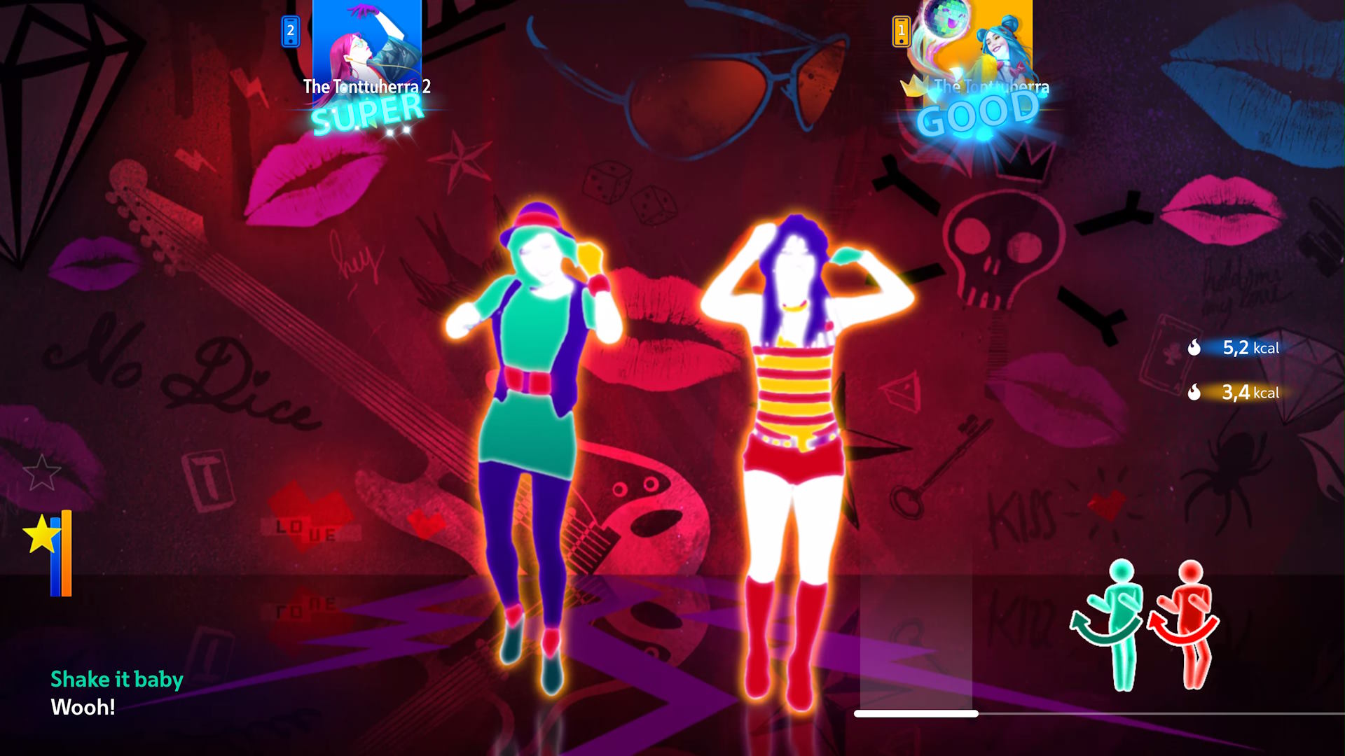 Kamerayhteydellä peli arvatenkin mittaa tarkemmin pelaajan liikkeitä, kun jalatkin tulevat mukaan ja isommat tähtimäärät jäävät helpommin kertymättä kuin puhelin kädessä -tekniikalla. Sanoisin silti, että puhelinvapaana heiluminen on mukavampaa, vaikkei itselläni ollut arvostelijamme Petterin aiempien vuosien peleissä kokemaa ongelmaa siinä, että vahingossa painaisin puhelimen lukitusnappulaa ja katkaisisin siten yhteyden pelin ja sovelluksen välillä. Kädet vapaana tanssiminen vain yksinkertaisesti muistuttaa sitä vanhaa, klassista tapaa pelata.