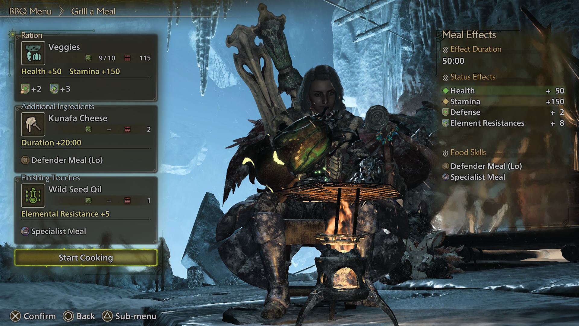 Muutenkin työn alla olevan hirviön tallustelupaikka on toisinaan hieman kauempana leiristä, joten pyörtymisen jälkeen on kiva päästä nopeasti takaisin uusintaotteluun, vaikka pieniä leirejä voikin sinne tänne myös rakennella uusiakin. Leireissä voidaan syödä hieman sapuskaa kitusiin, joka parantaa hetkellisesti (yleensä noin puoleksi tunniksi) pelaajan statseja. Pihviateria naamaan ja lisää terveyttä ja puolustuspistettä kroppaan. Grillailla voidaan myös tien päällä levitettävällä grillillä ja pelin aikana voidaan oppia uusia kokkausyhdistelmiäkin, jotka tuottavat erilaisia väliaikaisboosteja statseihin.