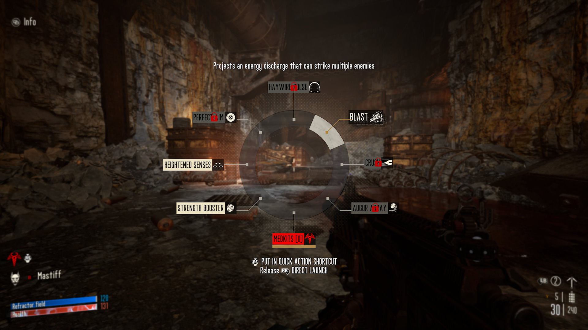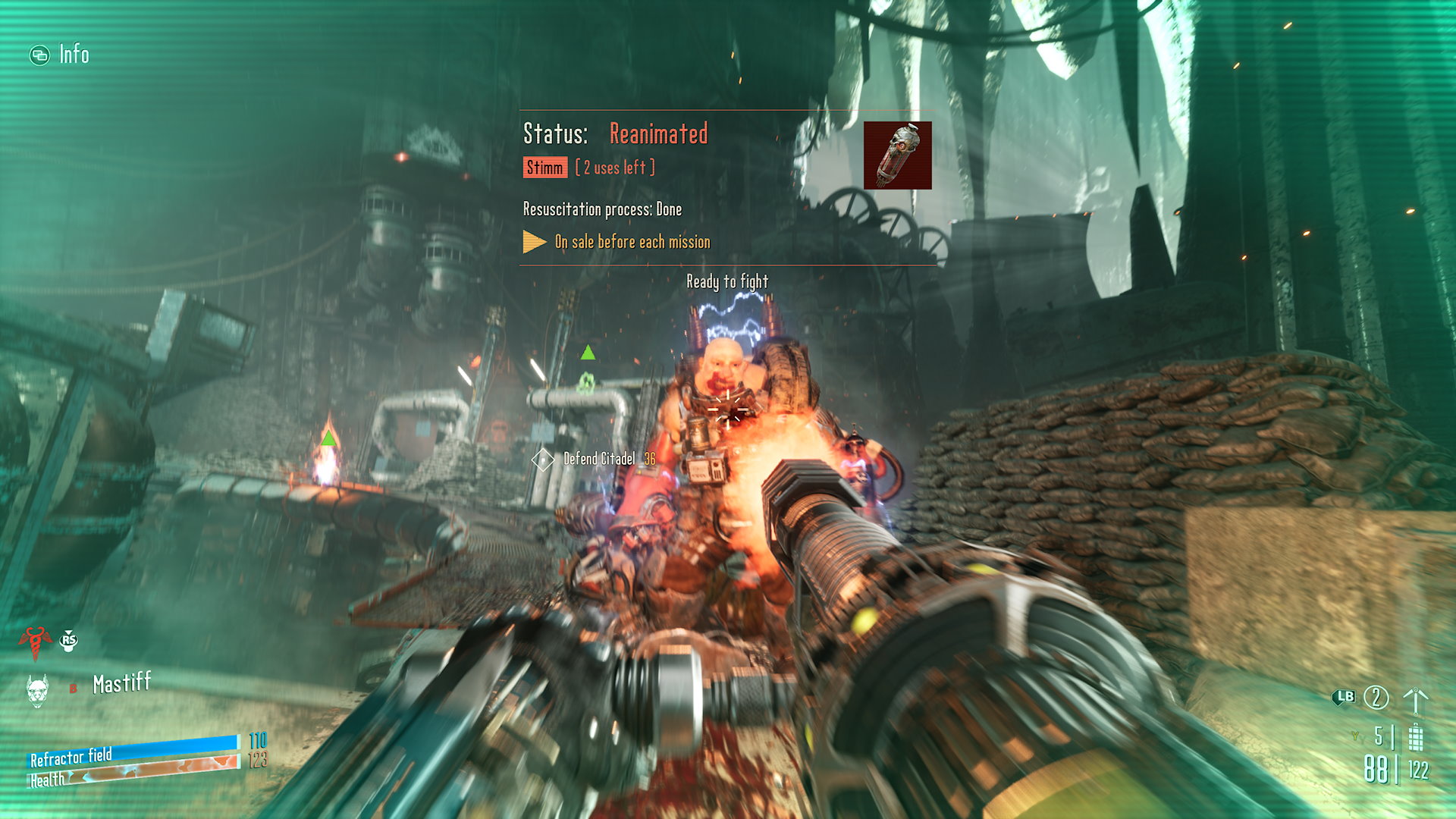 Teloittamalla vihollisia pärjää kuitenkin pitkälle, koska se tarjoaa jatkuvaa lisäenergian lähdettä tavallisten lääkintäpakkausten rinnalle. Toisin kuin Doomissa, teloitus onnistuu heikommin panssaroitujen vihollisten kohdalla jopa ilman mitään ensiosumia, joten pelaaja voi käytännössä brutaalisti teloittaa lauman päälle juoksevia kevytvihollisia X-nappulaa rämpyttämällä yhdessä pitkässä sarjassa, eikä toinen odottava vihollinen voi katkaista toimenpidettä. Isompien karjujen kanssa vaaditaan osuma jos toinenkin, ennen kuin teloitusta tarjoava X ilmestyy ruudulle. Neljännen tehtävän aikana onnistuin jo tienaamaan saavutuksen ”teloita 100 vihollista” – eli teloituksia kyllä tulee ja vähän liikaakin.