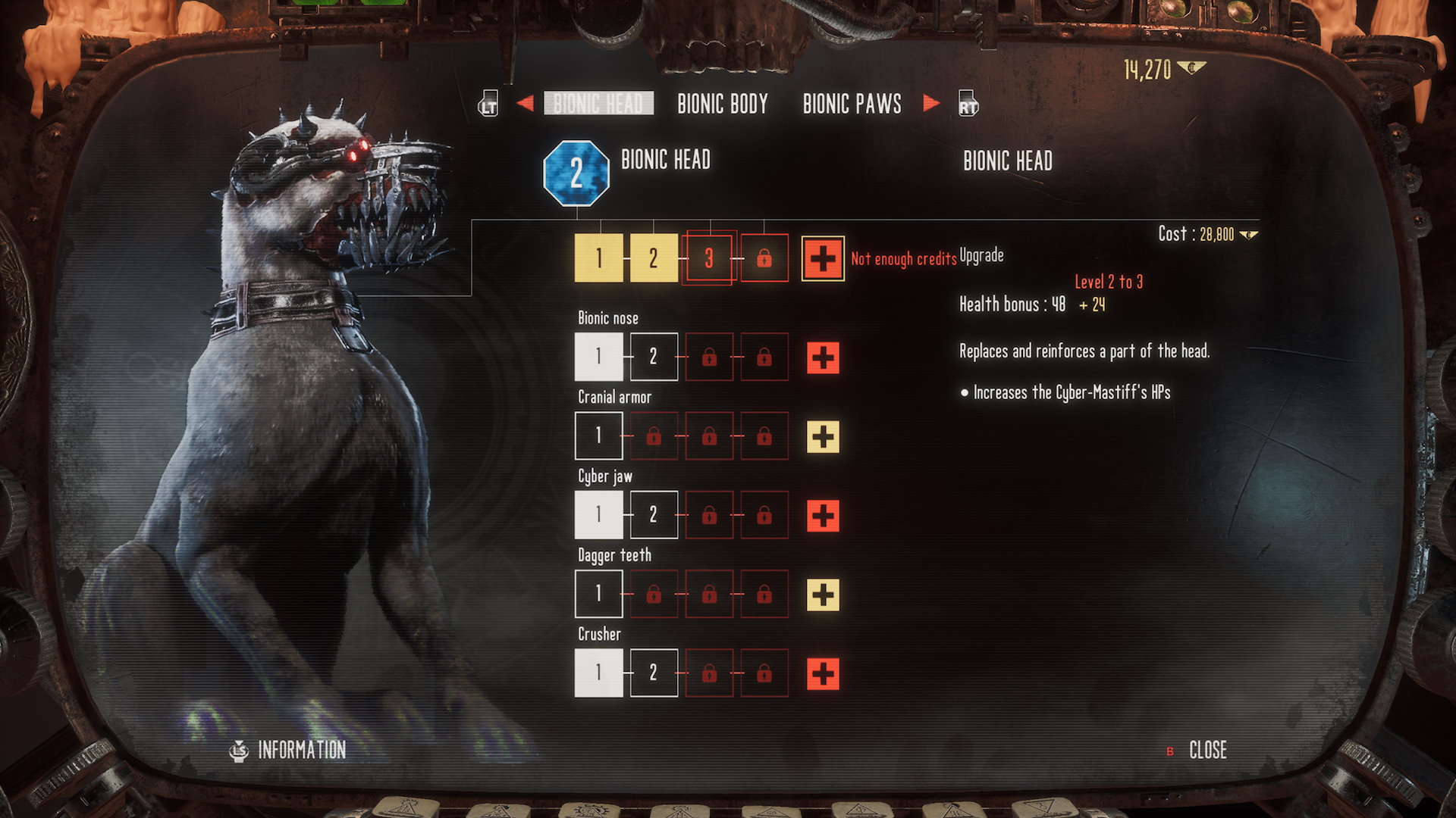 Necromunda: Hired Gunin hauskimpia ominaisuuksia lienee pelaajan matkassa (tai taskussa) kulkeva cyber-mastiffi, jota voi sitäkin päivitellä söpöstä lemmikistä veriseksi sotakoiraksi näyttävine implantteineen. Koiran voi lelua vinguttamalla käskyttää vihollisten kimppuun samalla, kun itse räiskii ja kyllä koira tekeekin tehokkaasti työnsä jo perustasolla. On kuitenkin pakko sanoa, pelaajan omien bionisten erikoiskykyjen lisäksi unohdin välillä myös koko koiran olemassa olon – niitä harvemmin tarvitsee, kun aseillakin jo pärjää vihollisia vastaan.