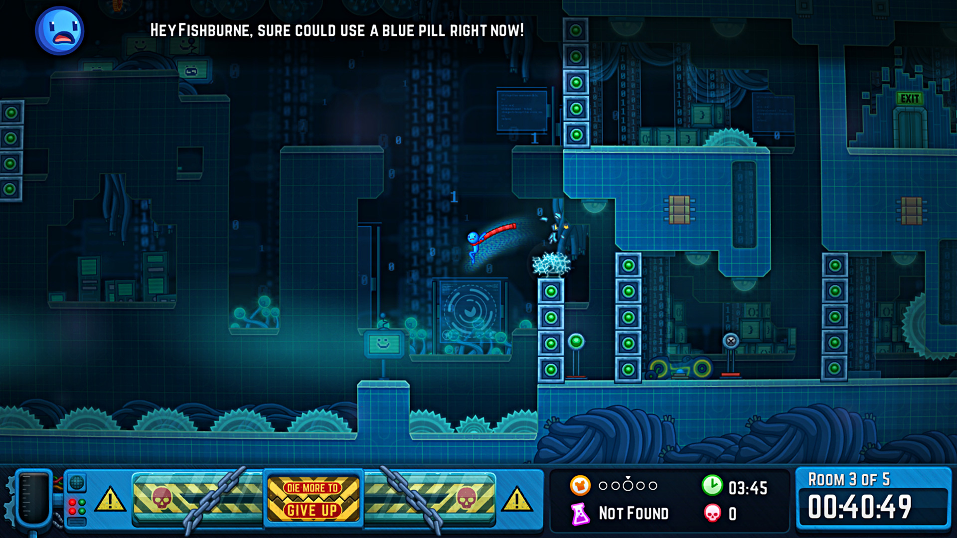 Never Give Up näyttää ja tuntuu peliltä, joka on olemassaolonsa velkaa Super Meat Boylle. Kyseessä on siis vaikeustasollaan mehusteleva tasohyppely, jossa juoksutetaan, hypitetään ja liu’utellaan nokkeluuksia laukova sininen tikku-ukko läpi hengenvaarallisten parkour-ratojen. Tyypillisesti alle minuutin rykäisyiksi puristetut tasot ovat sirkkeleillä, piikeillä, automaattitykeillä ynnä muilla kuolemanvaaroilla täytettyjä kujanjuoksuja, joiden läpäisy kysyy taitoa, keskittymistä ja kykyä sietää vastoinkäymisiä. Pienikin virhe johtaa tyypillisesti veriseen kuolemaan ja uusintayritykseen. Tarjolla on siis toistoa, toistoa ja toistoa, kunnes jokainen ajoitus, seinähyppy ja lattialiuku tulee suoraan selkärangasta kuin automaatiolla. Tai jos ei nyt ihan automaatiolla, niin ainakin inhimillisellä määrällä sadattelua, hikeä ja tuuria.